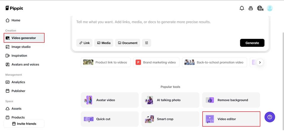 To access Pippit’s dashboard, first register. Then, from the menu on the left, pick ‘Video generator.’ Finally, choose ‘Video editor.’ You may either drag and drop the video into the editing interface or click ‘Click to upload‘ to import the video you wish to modify.