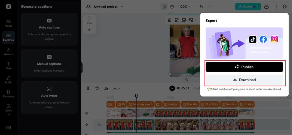 Finally, pick the resolution, format, frame rate, and quality, click ‘Export‘ in the upper right corner of the editing interface, select ‘Download,’ and click ‘Export‘ to save the movie. Otherwise, post the material straight to your social media profiles by clicking ‘Publish.’